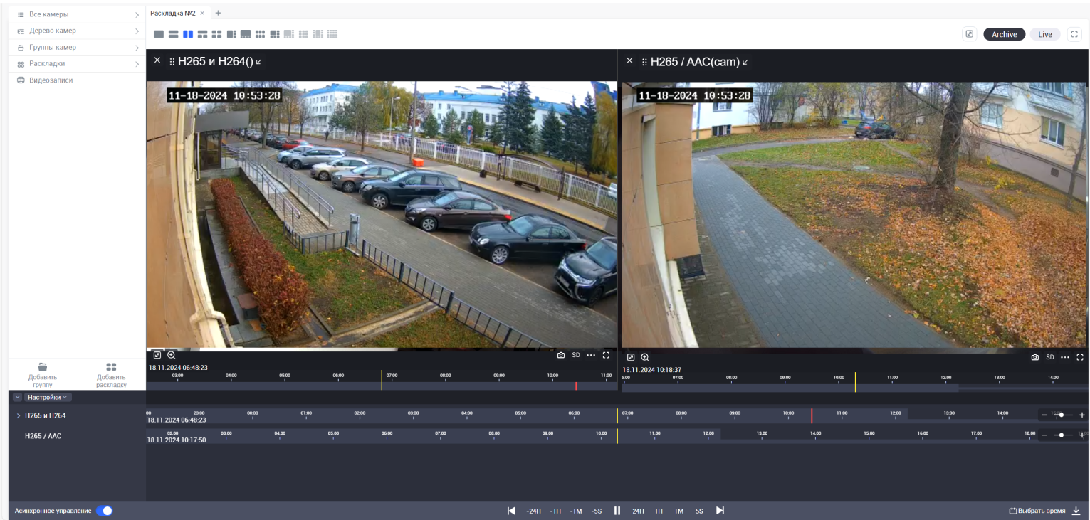 Если асинхронное управление включено, то вы можете перемещать таймлайн каждой камеры независимо от таймлайнов других камер. Таким образом вы можете настроить дату и время просмотра для каждой камеры отдельно.