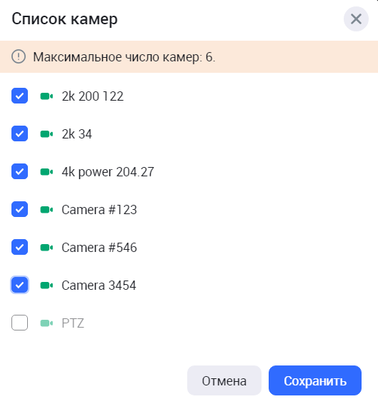 Просмотр архива ограничен одновременным просмотром записей в раскладке не более чем с шести камер. При попытке открыть архив из раскладки с большим количеством камер, пользователь будет перенаправлен на страницу, где необходимо выбрать не более шести камер для дальнейшего просмотра в архиве.