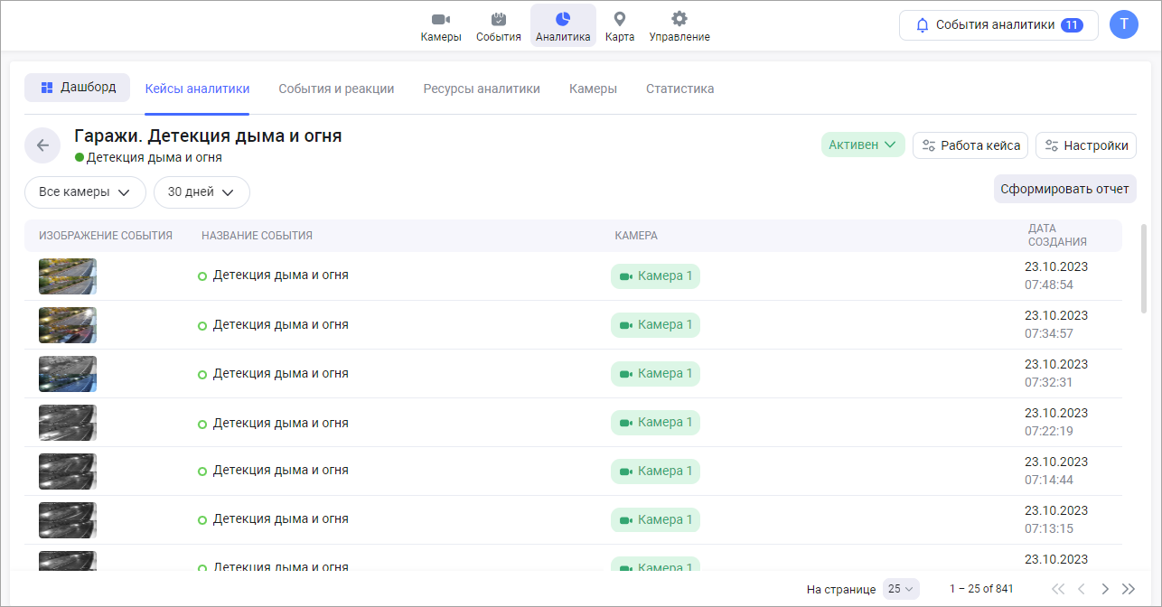 При просмотре кейса с видом аналитики «Детекция дыма и огня» отображается таблица, которая содержит изображение в момент события, название события, название камеры и дата создания события.