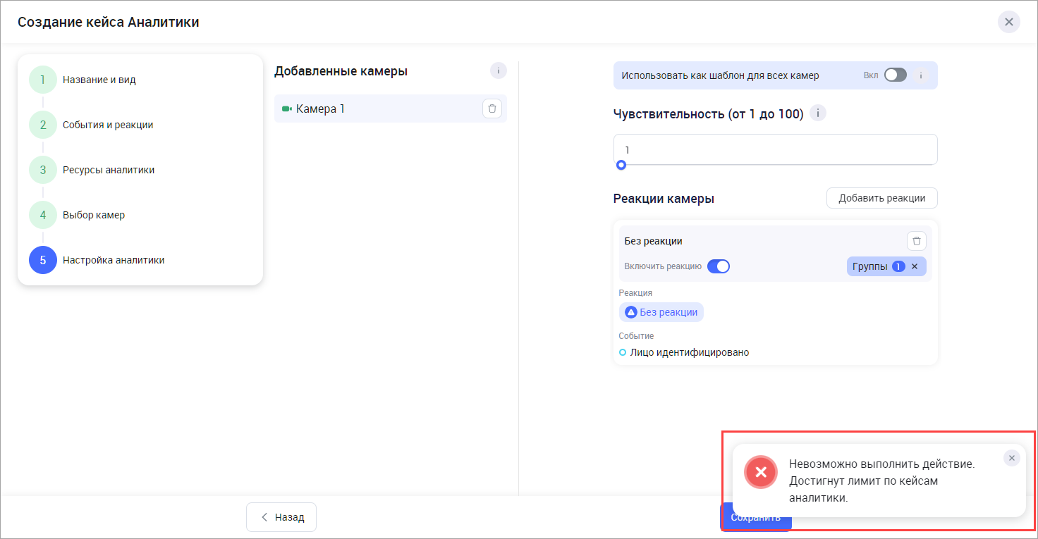 В случае отсутствия свободной лицензии при попытке создания кейса аналитики на экране будет отображено соответствующее сообщение.