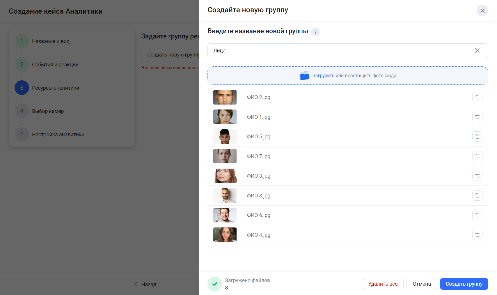 Добавление группы ресурсов в кейсе с видом аналитики «Распознавание лиц»