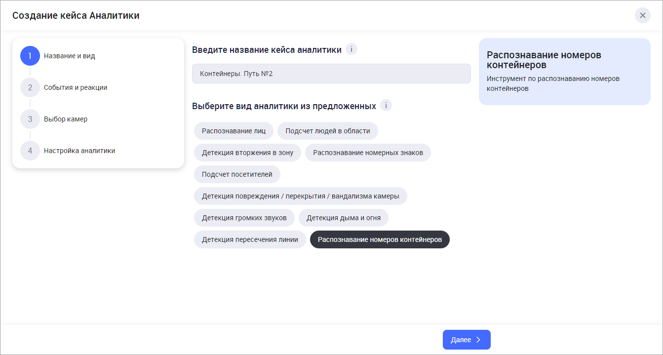 Выберите вид аналитики «Распознавание номеров контейнеров» из списка