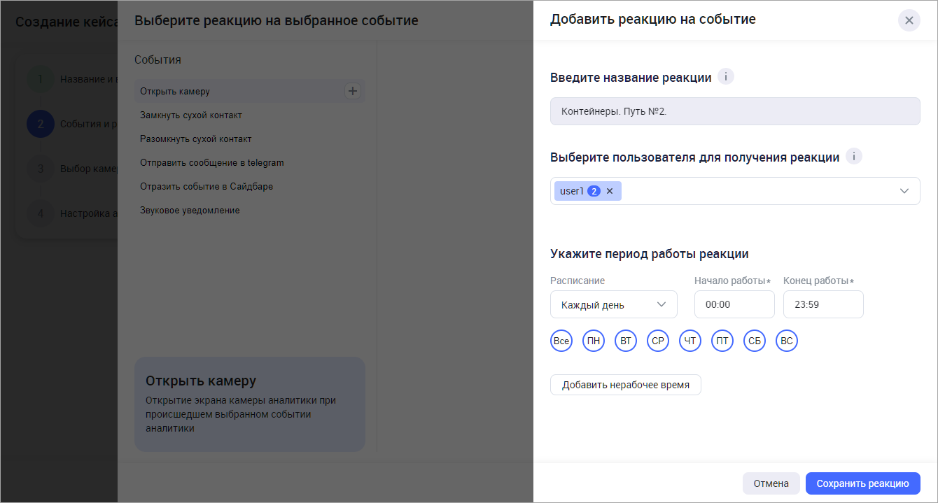 При необходимости включите опцию «Получение событий без реакции». Если при настройке камеры на Шаге 4 опция будет добавлена в список реакций, то при наступлении события никаких дополнительных оповещений поступать не будет. При этом событие будет отображено в общем списке событий при просмотре кейса аналитики.