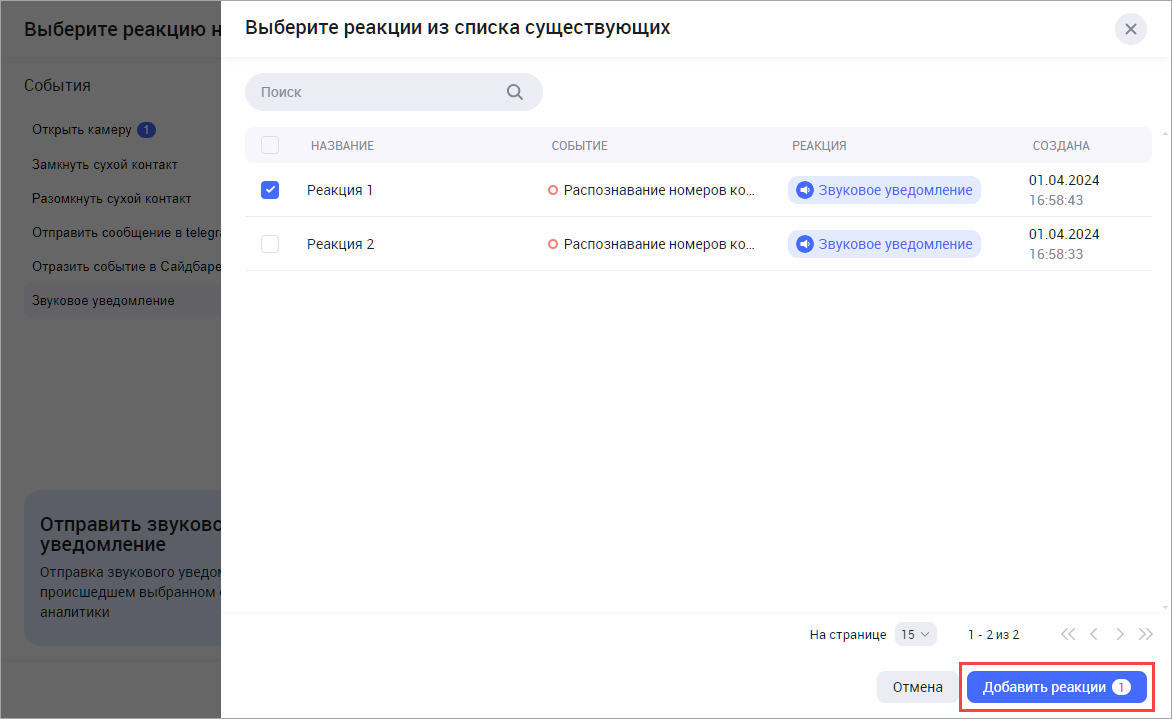 В результате выбранные реации отобразятся в списке реакций выбранного типа для текущего кейса. Для того, чтобы далее использовать созданную реакцию при настройке камер, нажмите «Добавить реакции».