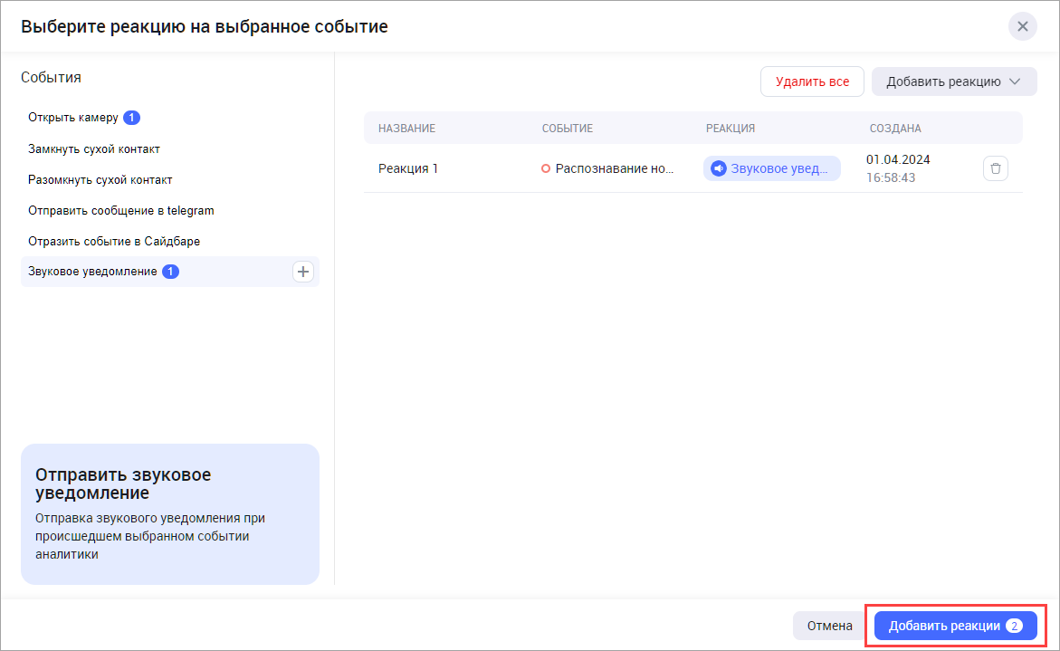 В результате созданная реакция отобразится в списке реакций выбранного типа. Для того, чтобы далее использовать созданную реакцию при настройке камер, нажмите «Добавить реакции».