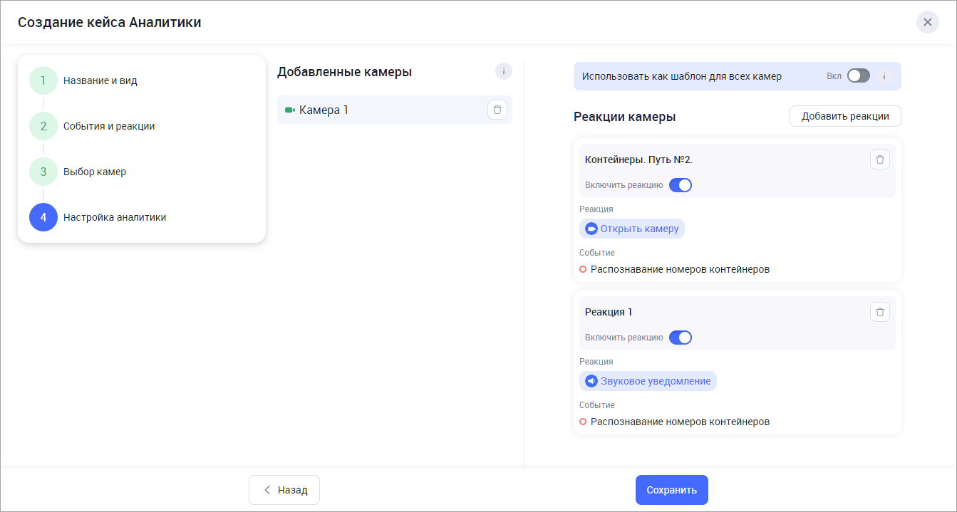 По умолчанию каждой камере назначаются все реакции, добавленные в текущий кейс аналитики на Шаге 2. При необходимости отредактируйте список реакций.