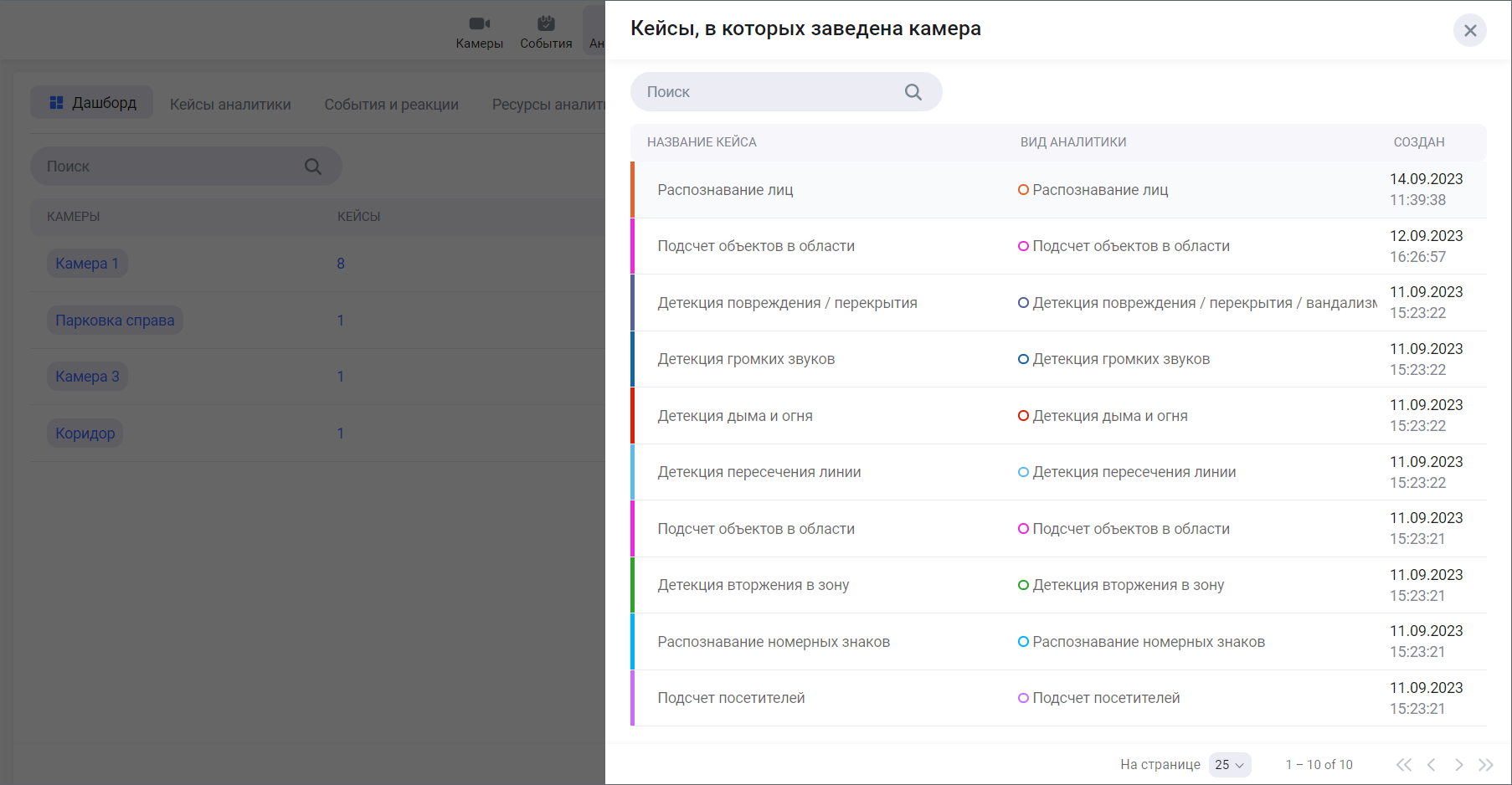 Количество кейсов, в которых задействована камера. При нажатии на число отображается список кейсов. В списке предусмотрен поиск по названию кейса аналитики