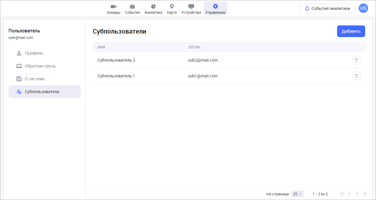 Для удаления пользователя откройте список субпользователей, нажмите кнопку удаления и подтвердите удаление.
