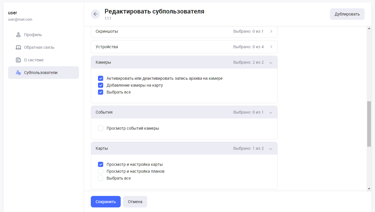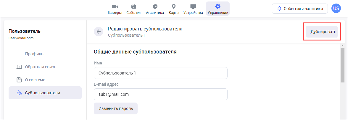 Предусмотрена функция дублирования субпользователя. Функция позволяет оперативно создать нового субпользователя с уже имеющимися настройками прежнего.
