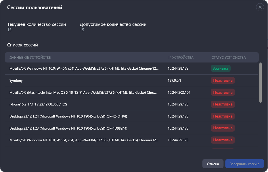 Если превышение обнаружено, то на экране отображается окно «Сессии пользователей» с информацией о количестве сессий, устройствах и ПО, на котором запущено приложение.