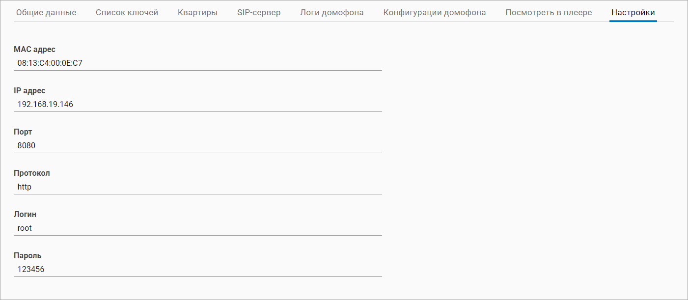 Вкладка «Настройки» предназначена для просмотра настроек подключения домофона. Настройки не доступны для редактирования.