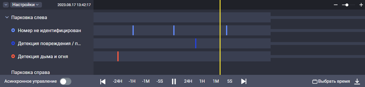 В нижней части рабочей области отображается список таймлайнов для всех камер. Управление временем просмотра зависит от настройки переключателя «Асинхронное управление».